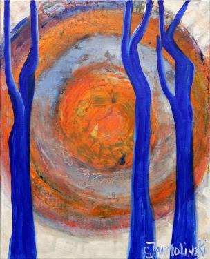 On this paticular day, the sun had been bright throughout. As the sun was setting I saw the fierce glow through my studio window. It was amazing. So many volumes of red and orange into yellow. It was intensive energy. I was in awe. Using one of my..............